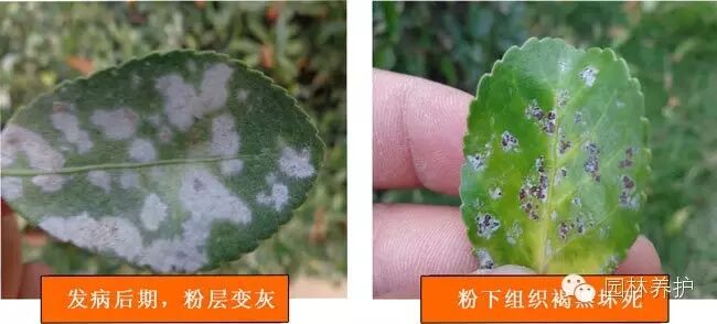 白粉病主要发生在嫩叶和新梢上。白粉大多分布于大叶黄杨的叶正面,也有生长在叶背面的,单个病斑圆形、白色,多个病斑连接后不规则,产生白粉霉斑。发病初期,表面上出现一层白色粉状霉层,后期白粉状霉层变为灰色,在叶片上散生许多白色圆形小斑,随着病斑逐渐扩大,相互愈合,成为不规则的大斑,甚至占据全部叶面。叶片病斑上产生白色粉状霉层,病斑逐渐褪绿,变黄,最后变褐黑色坏死。如将病斑表面白色粉层抹去时,在发病部位呈现黄色圆斑。病害严重时,导致叶片皱缩畸形,新梢扭曲、萎缩停长,并引起落叶枯梢。