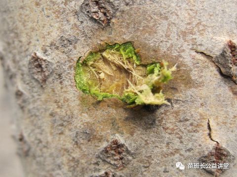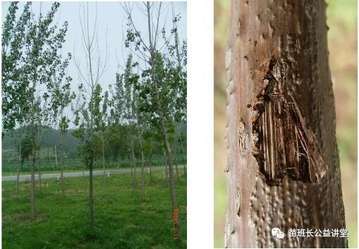 (6)其它:当出现干旱、水涝、日灼、冻害等恶劣条件,以及苗木移植或强度修剪后不易恢复树木生机时,病害便迅速发生,轻者影响树木生长,出现放叶晚、叶片变小、枯枝、枯干等病状,重者造成树木成片死亡。