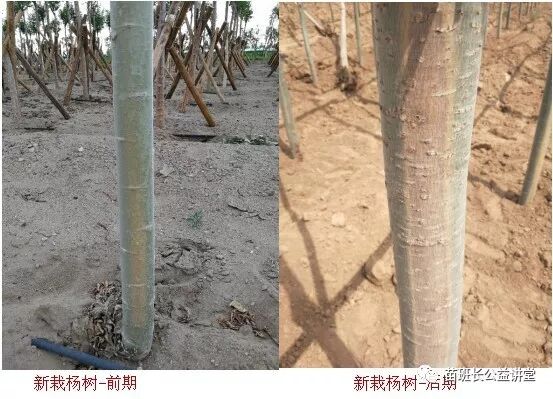 (2)采取合理的造林技术:杨树腐烂病的发生与树皮含水量的多少有密切关系,树皮含水量低,有利于菌丝的生长。因此,栽植时要做到随起随栽,浇足底水,缩短返苗期,增强抗性。去年冬季栽植的,要及时浇灌解冻水,及时满足苗木生长对水分的需求,避免出现生理缺水;