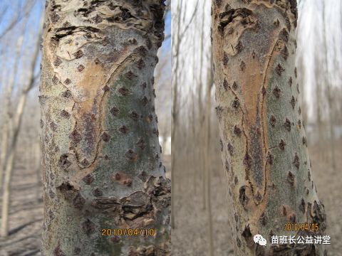 杨树烂皮病病斑如果绕树一周时,病斑以上的枝条死亡。如果环境条件对树木生长有力,病斑的周围组织则迅速长出愈合组织,阻止了病斑的继续发展,在粗皮杨树上表现不明显。