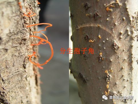 发病后期:在病斑上长出许多针头状小黑点(分生孢子器)。在潮湿和雨水之后多见针头状黑点中挤出桔红色胶质丝状物(分生孢子角)。这时病部组织变暗糟烂,与木质部容易剥离,病斑上下扩展比横向的速度快。