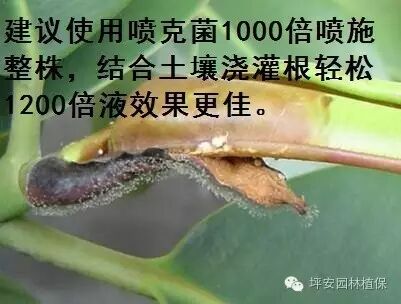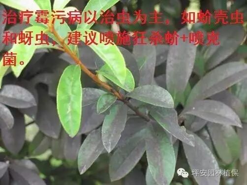 | 霉污病 | 叶面、枝梢表面上形成圆形黑色小霉斑,整个叶面黑色霉层或黑色粉层是该病的重要特征。 | 高温高湿、通风不良、虫害严重的地方,煤污病病害严重。 | 紫薇、高山榕、黄杨、月季、樟树等 | 修剪多余枝条,增加通风性,治疗霉污病以治虫为主,如蚧壳虫和蚜虫,建议喷施狂杀蚧+喷克菌。 |