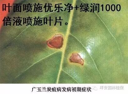 | 圆斑病 | 叶片初期产生红褐色小点,扩大形成圆形黑褐色病斑. | 借风雨传播,春秋季节发病严重. | 兰花,苏铁等 | 叶部出现不同形状,不同颜色的病斑都常被统称为叶斑病,叶斑病属真菌病害,高温多潮湿的情况易发病。几乎所有的园林植物或多或少都存在着叶斑病。叶斑病的防治要结合修剪,烧毁枯枝残叶,用优乐净+绿润混合稀释喷施。发病初期可用绿盾800倍液喷施。喷药时尽量做到正反两面都喷到。 |