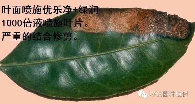 | 炭疽病 | 在叶片病部长黑色小点,有轮状斑纹,严重时半块叶片干枯。 | 湿度大是诱发该病的主要原因,特别是高温下雨后出现较多 | 蜘蛛兰、桂花、黄榕、黄杨、广玉兰、麦冬等 | 叶面喷施优乐净+绿润1000倍液喷施叶片。严重的结合修剪。 |