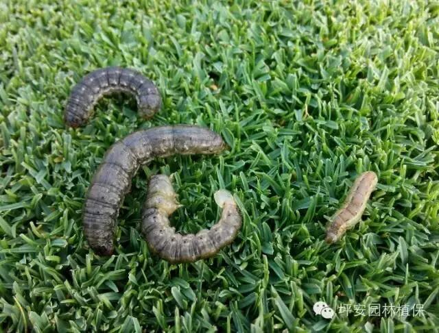 夜蛾、草地螟、地老虎等害虫会把叶脉及嫩茎吃光,阴雨天昼夜咬食危害。轻者造成草坪发黄,如不及时防治,严重时会造成草坪整片死亡,严重影响草坪的观赏和正常生长。高龄幼虫在草坪根际活动虫多,虫粪较明显,多在早晚和夜间取食。5至10月份均有此虫危害。幼虫白天、夜间均取食,以夜间为主。白天栖息于草坪草的叶背、根茎部或贴近土壤潮湿处。高龄幼虫在草坪根际活动虫多,虫粪较明显,多在早晚和夜间取食。