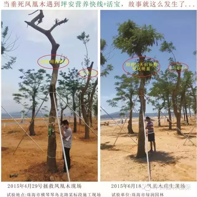 不适合挂吊袋、插瓶的树木使用输液的方法只会“自找麻烦”。比如以下树木均不适合挂吊袋、插瓶:桃、碧桃、火炬树、松柏、樱桃、荔枝、龙眼、樱花、柑橘、杏、奈、梅、柠檬、木棉、棕榈科植物等。这类树木由于病菌侵袭、虫蛀、机械损伤、冻害、日灼、造成伤口和营养失调等因素,会出现树干流胶或流脂现象。又如雪松,一旦造成伤口,松香就会溢出,吊袋的输液孔也会被堵塞。