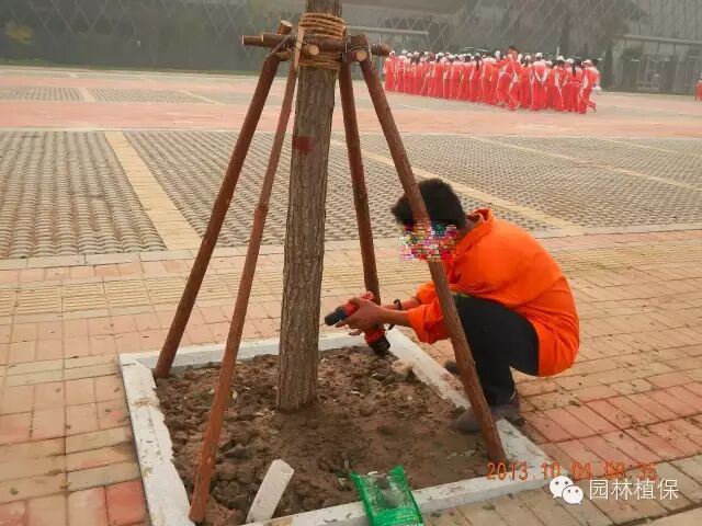 输入液体温度过高或者过低,都会影响其正常代谢。很多养护单位为了保证新移栽大树水分收支平衡,除了日常树体遮阴、喷水、喷抑制蒸腾剂等措施减少水分蒸发外,也采用吊注水的方法补充树体水分,因此一定要尽量让输入液温、气温和树体温度达到一致,对曝晒面吊袋要进行遮阴降温处理。尽量挂在树干北侧,高温季节输液时,输液瓶或输液袋应用遮阳网遮盖,避免瓶内液体温度上升,对树体造成不利影响。单孔输液时间及输后处理,在输液过程中一定要注意:同一输液孔使用时间不宜过长(不超过15天),输液时间过长,钻注的伤口产生愈伤组织堵塞孔口影响液流,还有些树不耐水渍,孔口容易腐烂,造成难以愈合的伤口,因此若需连续补液,要及时更换插孔,并对使用后的插孔即使进行消毒促愈合处理,输液完之后的袋子要及时取下,防液体回流。